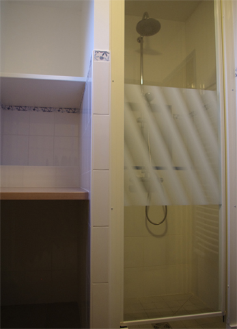 Cabine de douche spacieuse et accessible. Coin rangement : plusieurs étagères, en plus des placards sous la vasque.